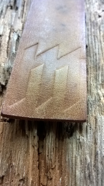 W załączeniu dwie fotki - efekt wyciskania w skórze. Skóka nie była nowa (kawałki starej torby, nowa skóra jest bardziej podatna na wyciskanie), matryce były drewnianie (małe "m" to miękka sosna, duże "M" to twardy bambus), skóra była zmoczona (aby nadać jej miekkośći i podatności na odkształcenia), ściśnięte imadłem na kilka dni - aż skóra sama powoli wyschnie. To akurat skóra juchtowa, gruba, mająca możliwości na ściskanie.azhag pisze:Chętnie zobaczę Twoje zdjęcia. A wyszywanie niestety jest żmudne i niezbyt dokładne, litery by musiały być kulfonami, żeby były czytelne.